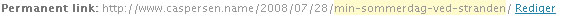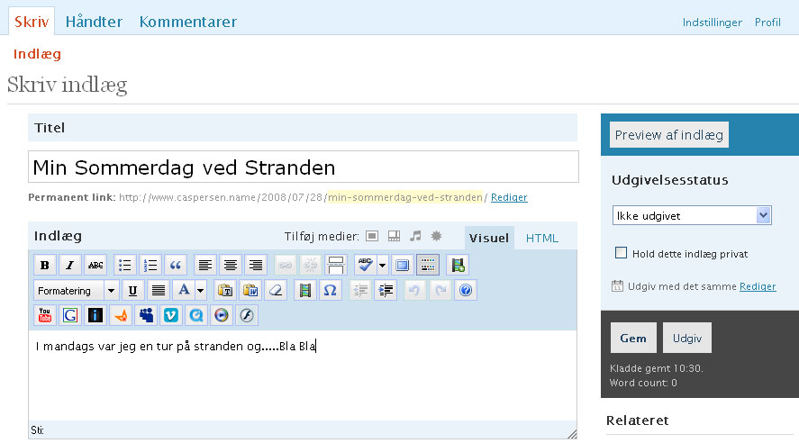 Du er nu næsten færdig, men inden du trykker “Udgiv” knappen, så check lige hvordan det “Permanente link” ser ud. Det er nemlig konstrueret udfra din egen “Titel” og her kan du skrive hvad du vil. Men permanente-links må ikke indeholde mellemrum (brug bindestreg “-“ eller underscore “_” istedet) og brug aldrig Æ,Ø,Å, hvis dette er tilfældet så tryk på “Rediger” knappen som vist herunder og skriv et nyt sigende Permanent-link (permanentlink som navnet siger er permanent dvs du kan sende dette link i en email til venner og de vil så se dit indlæg)
