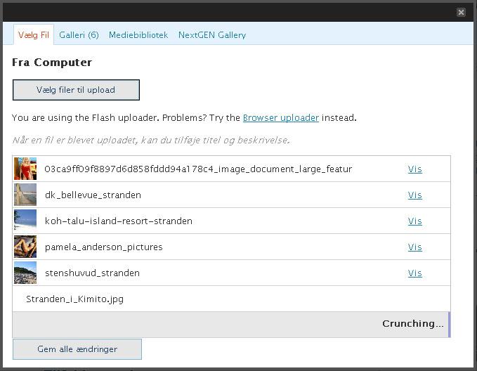 Tryk på knappen “Vælg filer til Upload” og vælg et billed ad gangen eller flere (CTRL+Click musen). Du skulle nu være igang med at uploade dine billeder og det ser sådan her ud: