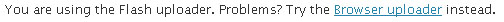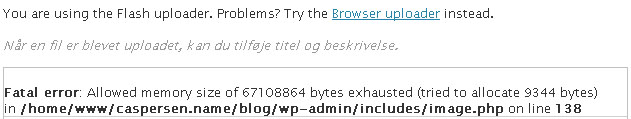 Så skyldes det nok at dine billeder er ret store og du skal derfor ikke bruge Flash uploaderen men derimod Browser Uploaderen så klik på den istedet se her: