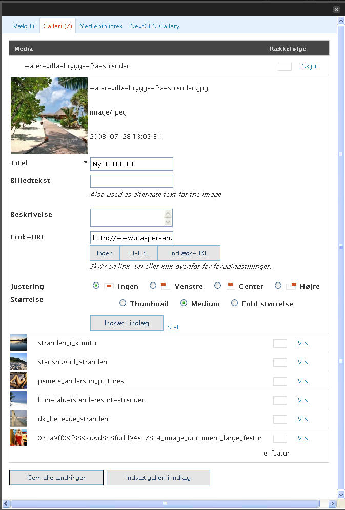 Husk at trykke på knappen “Gem alle ændringer” når du er færdig, du er nu klar til at indsætte dit nye Galleri og trykker derfor på knappen “Indsæt galleri i indlæg” du skulle nu se “gallery” kommandoen i dit indlæg som vist her: