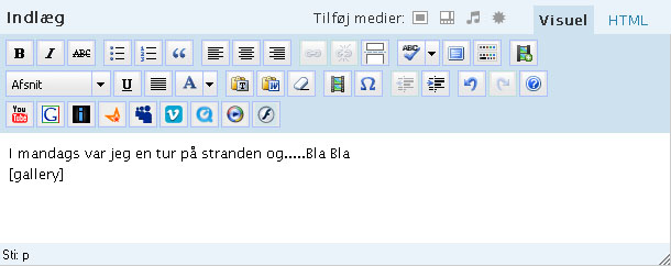 Du har nu skrevet en Titel til dit indlæg og skrevet lidt tekst i dit Indlæg og vil nu gerne have indsat nogle billeder, Video, eller Lyd filer/Musik, dette gøres altsammen på samme måde så jeg vil derfor kun gennemgå et enkelt eksempel.