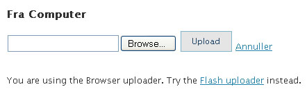 Du skulle nu se nedestående Upload funktion istedet, tryk på “Browse” og vælg hvert billede et af gangen og tryk derefter på “Upload” knappen når du er klar til at uploade dine billeder.