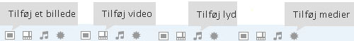 Her kan du se alle knapperne for indsætning af et billede, en sang eller video ved at bruge knappen ved siden af “Tilføj medier“: i toppen som vist herunder: